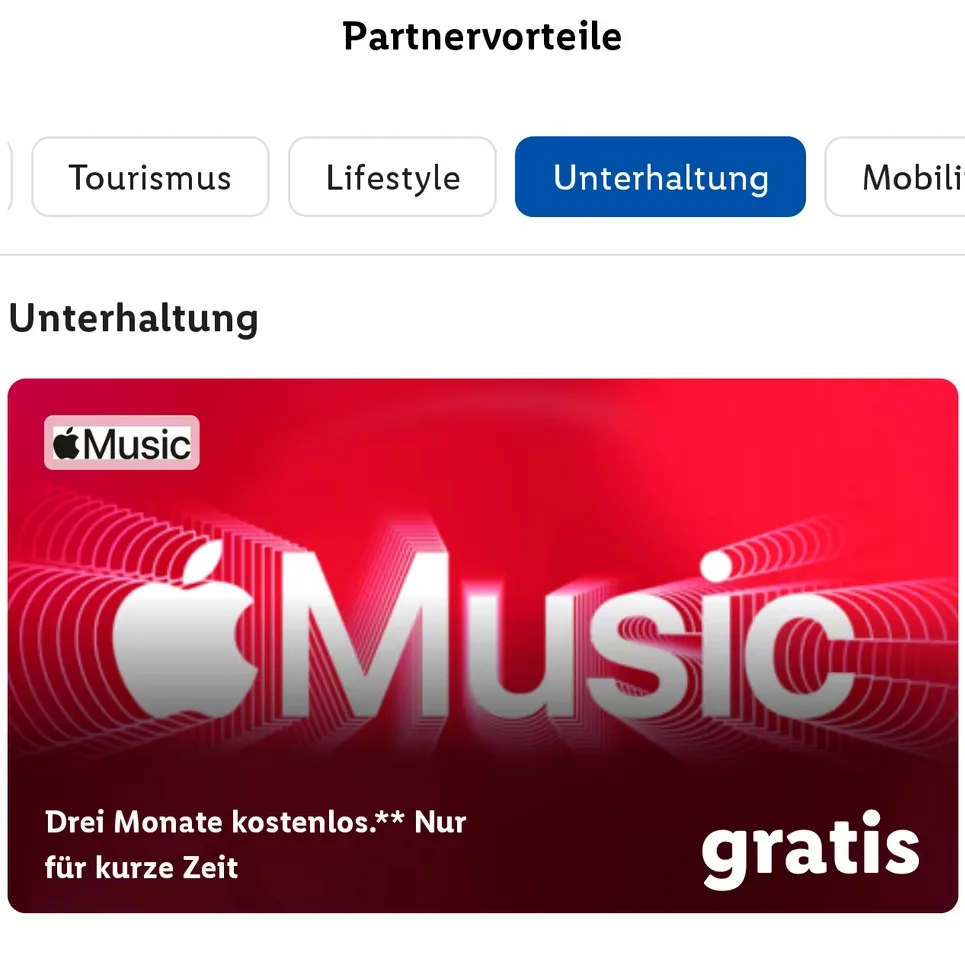 1078° Gepostet vor 21 Stunden [LIDL] Apple Music 3 Monate kostenlos für LIDL Plus Kunden | für Apple Neukunden | jederzeit kündbar | gültig bis 18. April